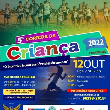 Na próxima quarta-feira, 12 de outubro, para comemorar o feriado do dia das crianças, a Associação Desportiva Cultural realiza a 5ª Corrida da Criança na cidade de Poções. O evento acontecerá na Praça do Divino e terá início às 7 horas da manhã com a distribuição de numeração de peito, às 8h acontece a concentração, e a largada será às 8h30min com o percurso pela Praça do Divino.